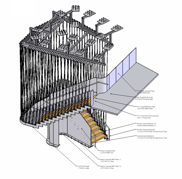 Suspended feature stair in the lobby of 1 Hotel Brooklyn Bridge with rusty metal patina.